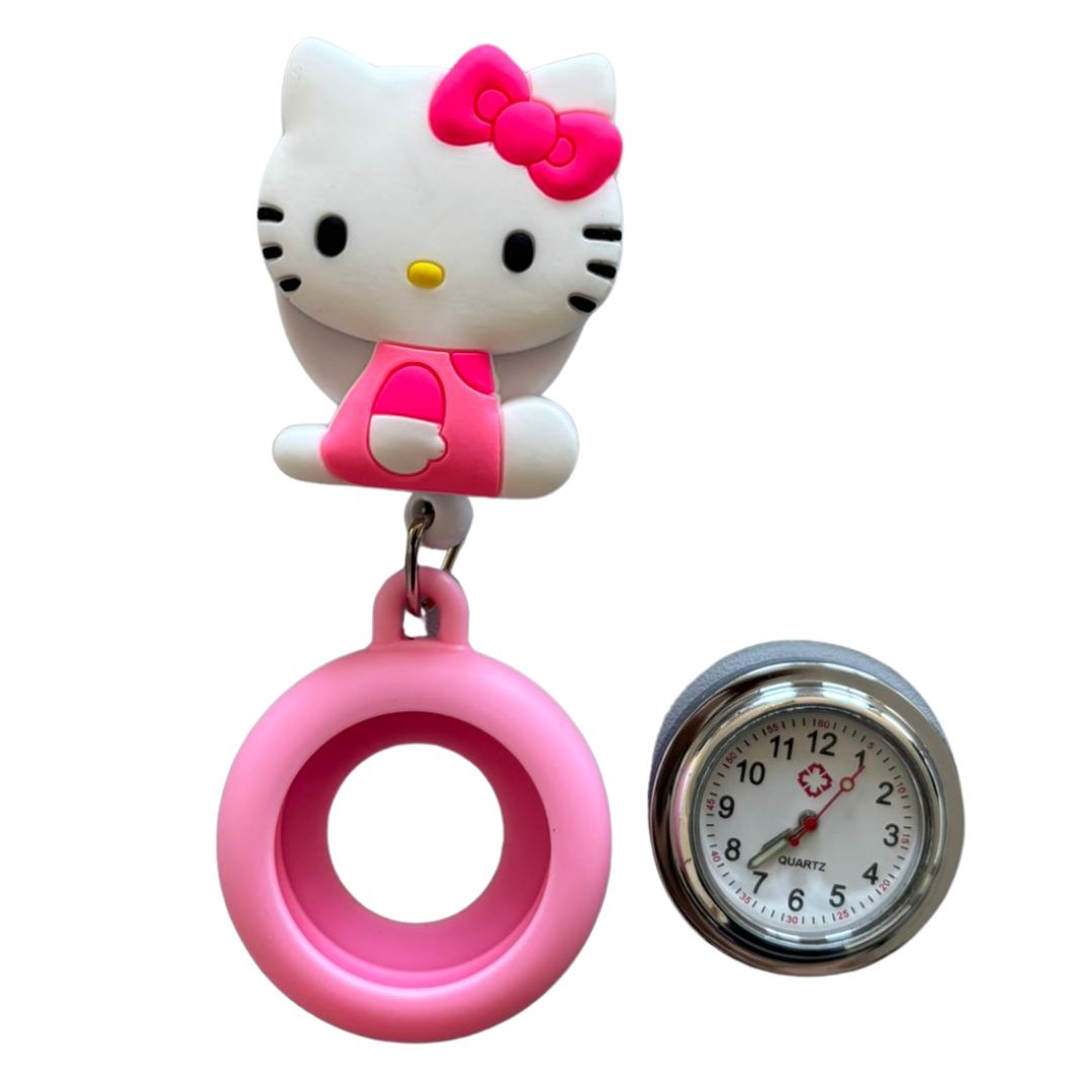 Orologio da infermiere a forma “Hello Kitty”: clip per camice, cordino a molla per estrazione rapida, lancette fosforescenti per visibilità anche al buio, cassa in silicone lavabile e disinfettabile — design allegro e professionale tutto in uno!