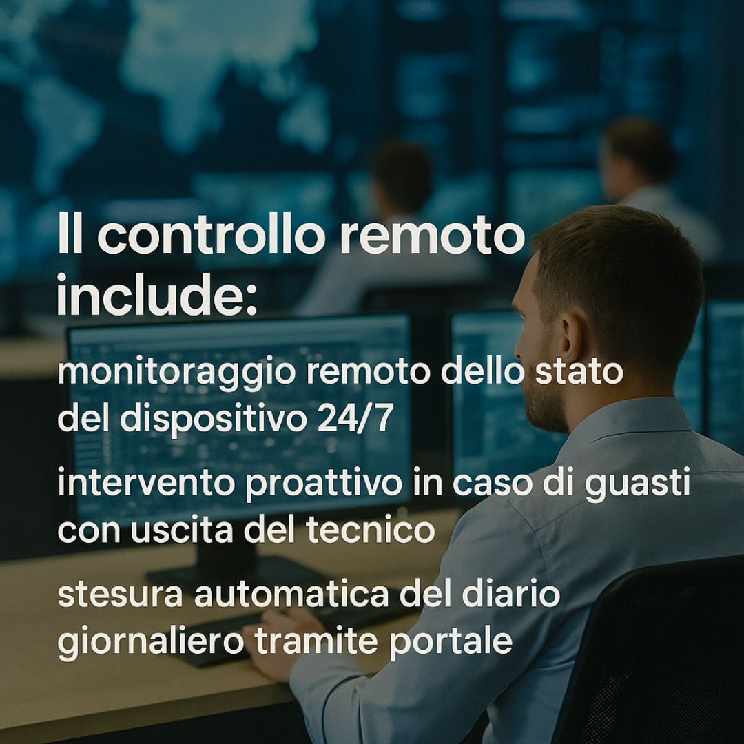 • Esonero Totale di Responsabilità: Il cliente è totalmente sollevato dall'obbligo di ispezione e controllo giornaliero e dalla relativa compilazione del registro o diario. La responsabilità del controllo funzionale e ispettivo è interamente a carico del nostro servizio.