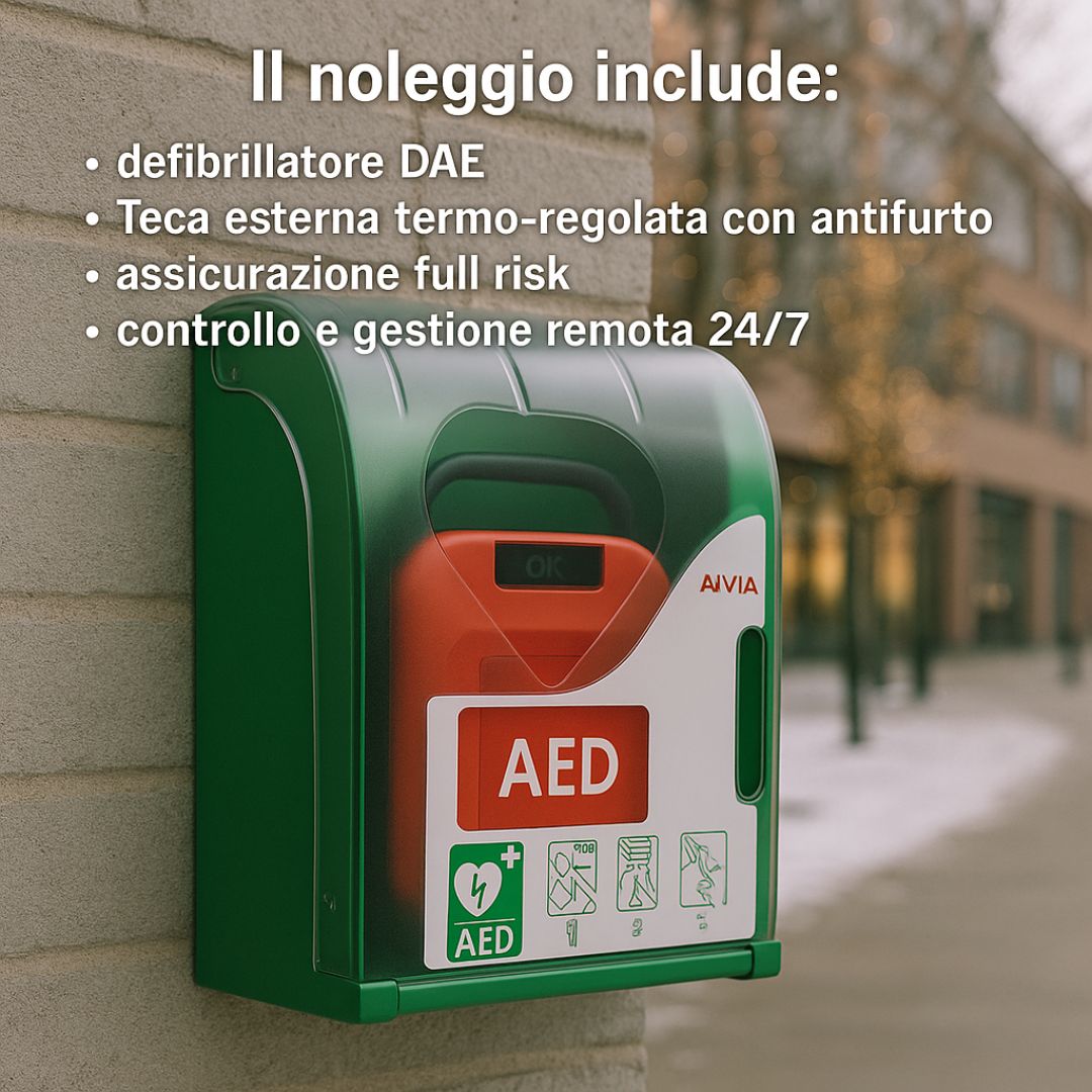 Il canone include l'assicurazione Full Risk completa (furto, atti vandalici, malfunzionamento) e la sostituzione gratuita di batteria e piastre in caso di utilizzo del defibrillatore.